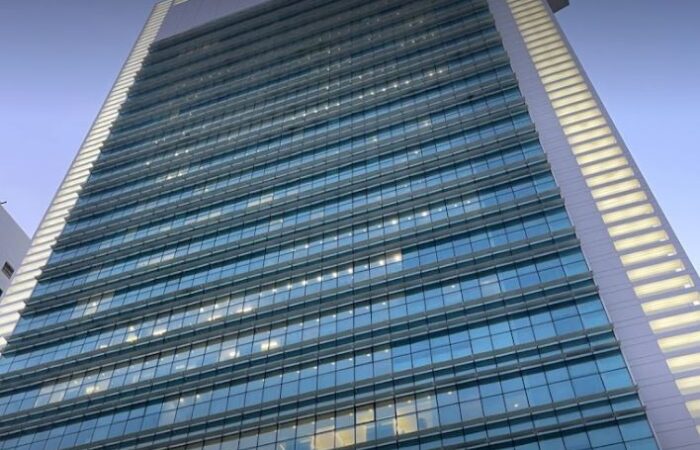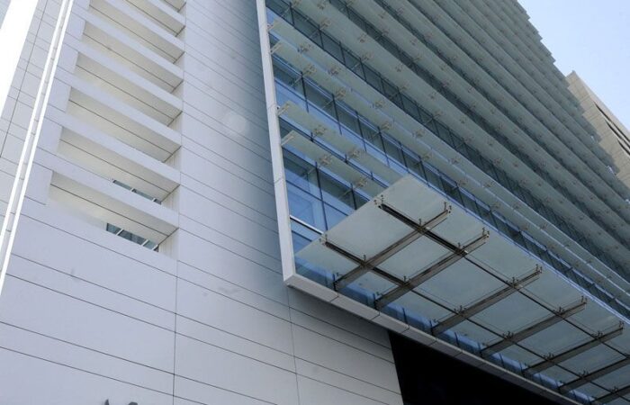 The Abu Dhabi Commercial Bank consists of twenty-five floors, mezzanine floor, double height ground floor and three basements, with a double cantilevered steel roof cladded truss with a total height of 125.00m.. This tall structure encompasses many unusual features, which clearly manifest the modern architectural concept. The primary load bearing members in this structure are: the post-tensioned floor slabs, the core walls and columns.