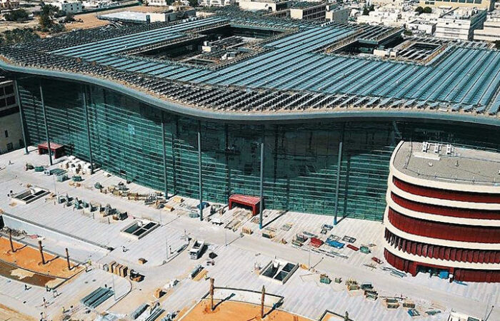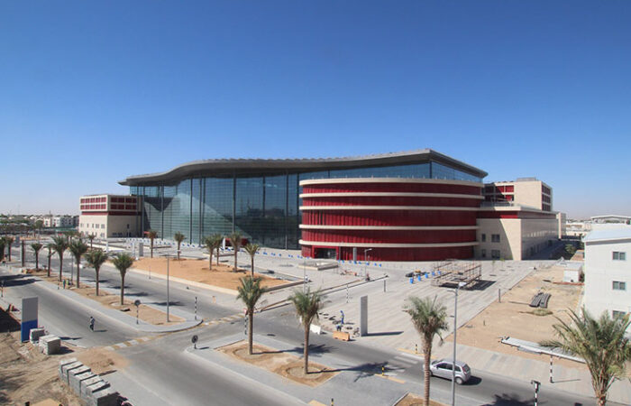The Main Hospital complex in the eastern part of the plot is connected with the supply and disposal area in the western part by an Utility Tunnel system with a length of approx. 1000 m. The Main Hospital is situated on the eastern part of the Al Ain Hospital complex. It consists of two underground levels and up to five stories above ground (seven stories for the heliport). Above common areas an atrium is surrounded by a glass facade and covered by a roof made of glass, steel